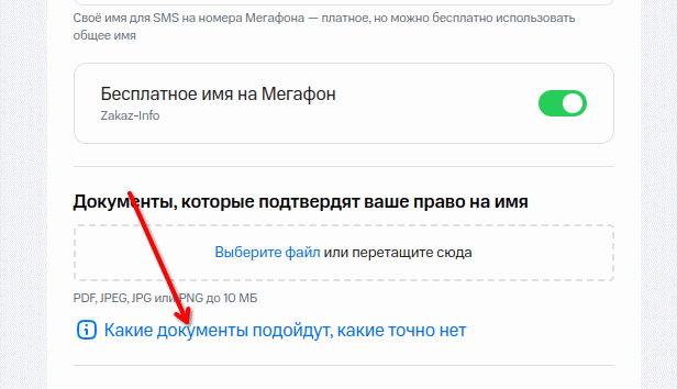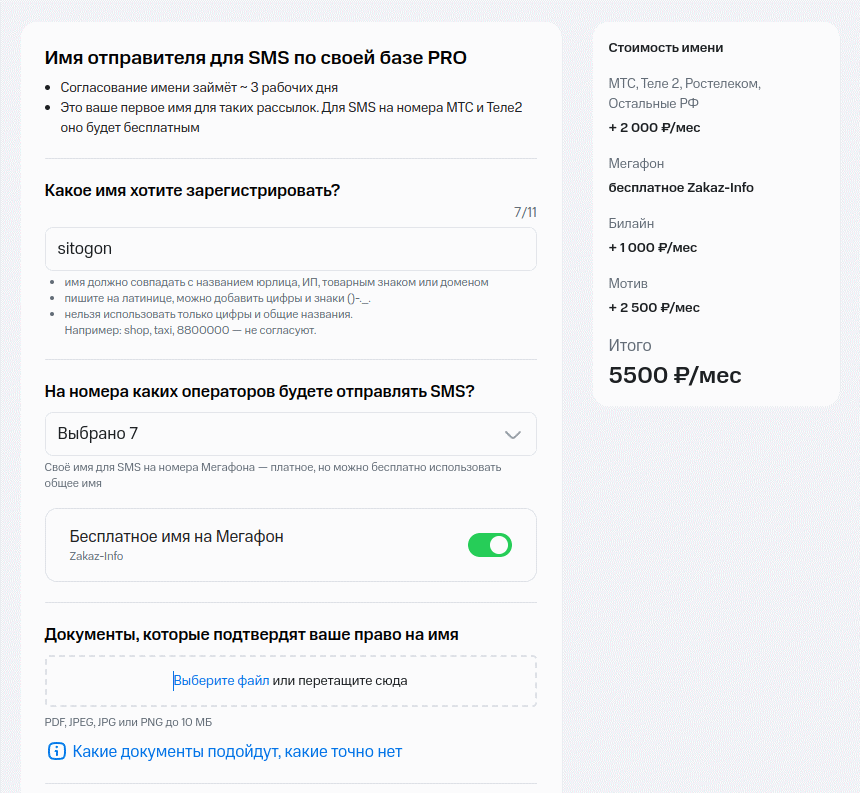 Необходимо будет прикрепить документы, подтверждающие то, что вы имеете полное моральное право регистрировать данное имя отправителя.
