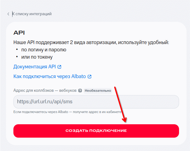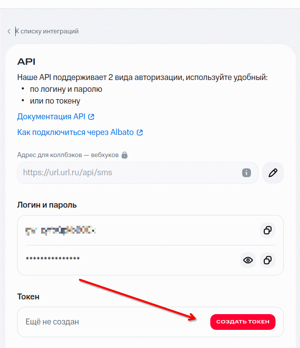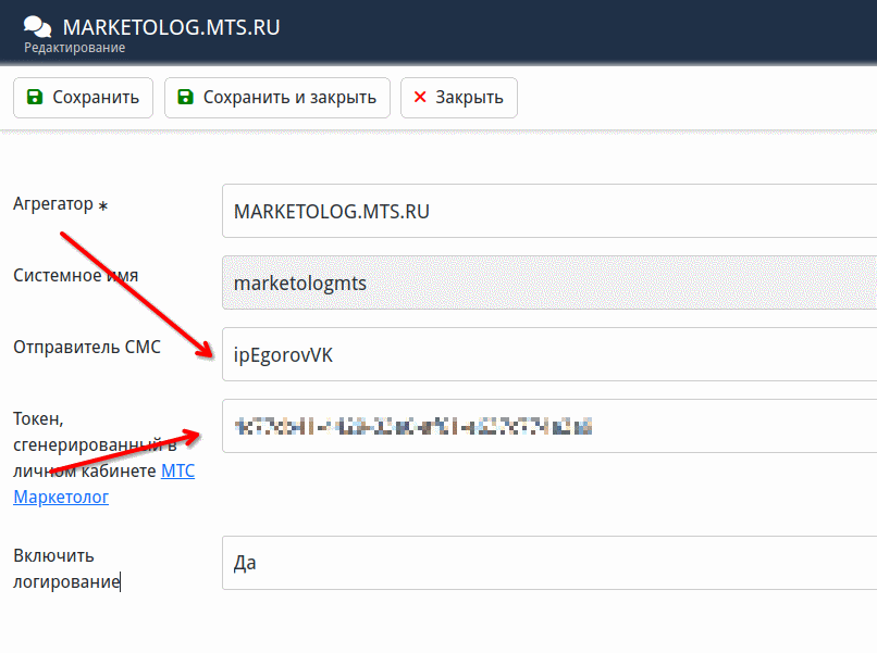 На странице редактирования необходимо заполнить поля «Отправитель СМС» и «Токен».