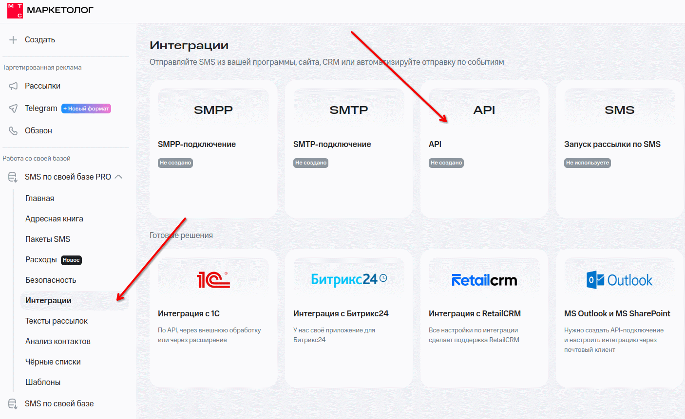 Для его получения в боковом меню личного кабинета «МТС Маркетолог» переходим: