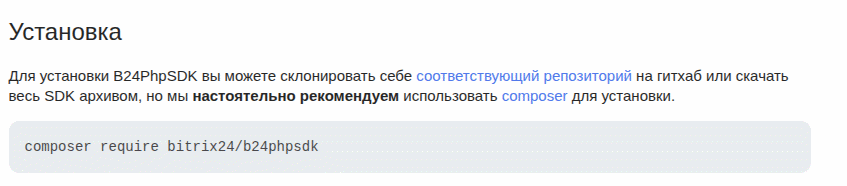 Теперь отправимся на сайт разработчика библиотеки «B24PhpSDK». И находим то место, где он пишет команду для установки.